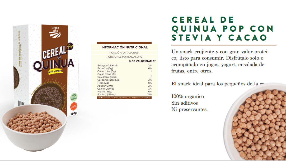 Cereal Quinua Pop con Stevia, es un Snack crujiente y con gran valor proteico, listo para consumir sin necesidad de cocinarlo. Disfrútalo solo o acompáñalo en jugos, yogur, ensalada de frutas, entre otros.