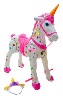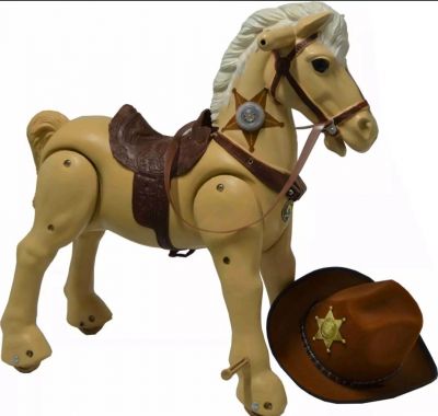 Caballo montable con acción de avance, el mecanismo utiliza el peso del niño para abrir y cerrar las patas del caballo, simulando que va galopando.